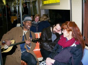 It’s a tough crowd on the late night 1 Train going uptown, but he manages to collect a few dollars.