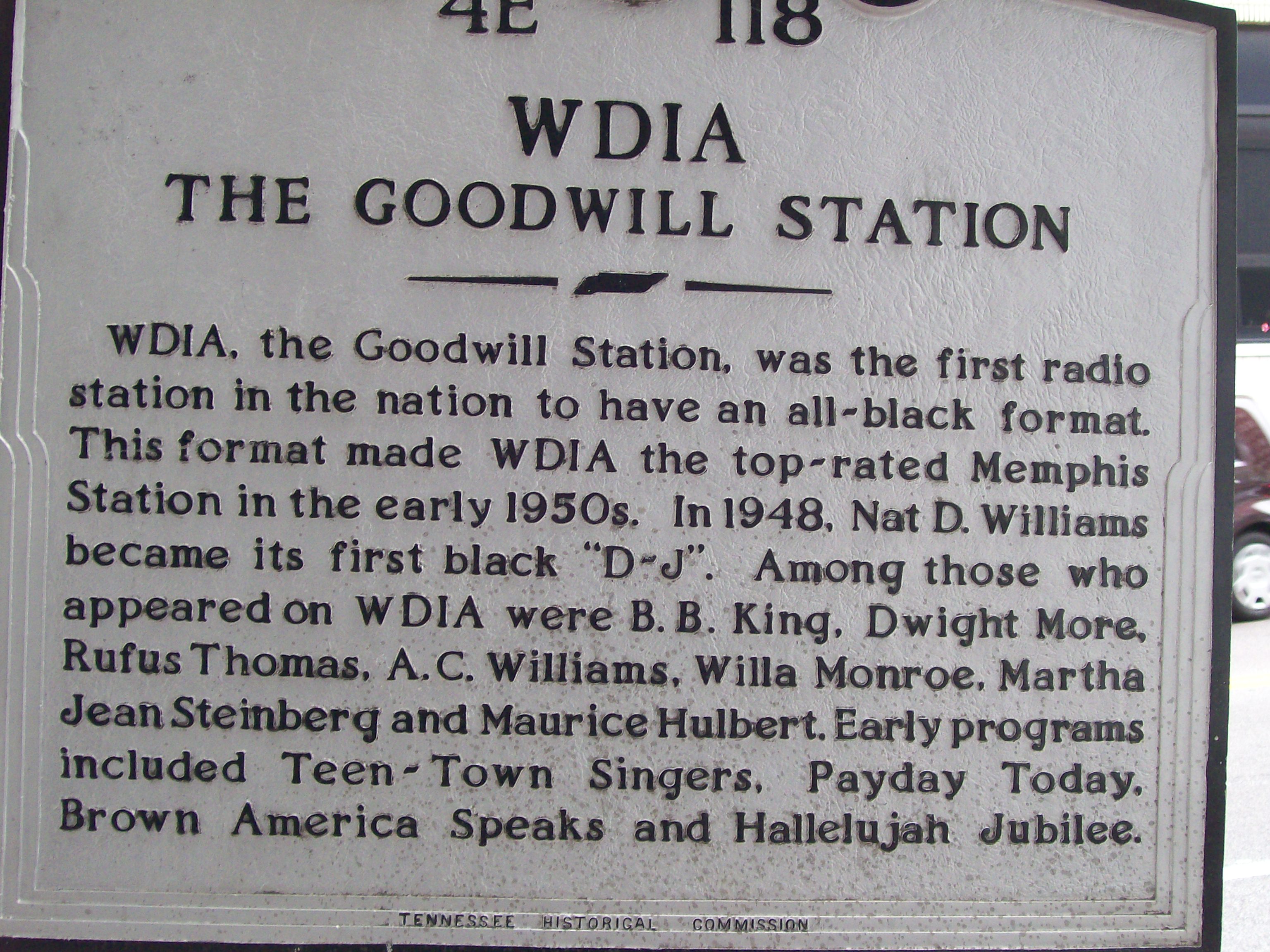 Then perhaps I can point Naomi to WDIA in Memphis – America’s original “all black station”. I first discovered it by accident on my tour of the States when I spotted an old WDIA sign outside a bank (the original home of the station) and a plaque briefly outlining its history. This is a big file so you can see the text.