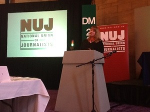 Significant event number two. The NUJ logo in the centre of this picture falls down, hitting President Donnacha DeLong on the head.