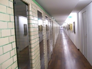 This really is bonkers, but it works. And because nobody’s actually swimming in the pool, there’s no smell of chlorine. The main exhibit in the pool area changes every season. But around the sides are various painting and ceramics, hidden in what used to be the changing cubicles.
