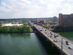 The mighty Colorado River – known as the Red River – snakes its way through the middle of Austin. And thanks to some neat design, there’s a good view from the elevator mounted on the outside of the hotel.