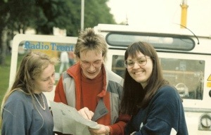 Pictured here are two former staff from the Radio Trent Careline (along with presenter David Lloyd). Generously funded by benevolent local authorities, social action desks operated on both BBC and commercial stations. Nottingham was lucky to have not one, but two such services – crammed into an old shop building on Mansfield Road were Trent’s Careline and BBC Radio Nottingham’s ActionLine (initially known as the rather cryptic TX-RX).
