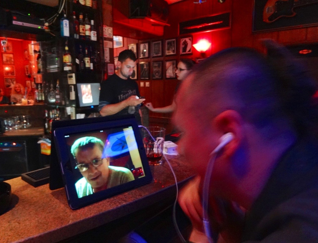 I’m equally pleased to see that Tomasz is a bit of a techno geek, and seasoned traveller too. He shows me his holiday snaps of boring places, like Madagascar and Jamaica. I’m not at all jealous. Then, fires up an app on his iPad, and suddenly he’s talking to his dad. From a rock bar. As you do.