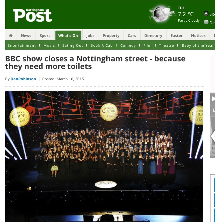 Of course – a WHOLE STREET will be closed to accommodate toilets! What a great impression that gives. The article itself correctly points out that it’s not actually a very big street and that none of the local businesses are too fussed about it. The choir competition is a great story in its own right – but of course it’s the negative headline which grabs the attention.