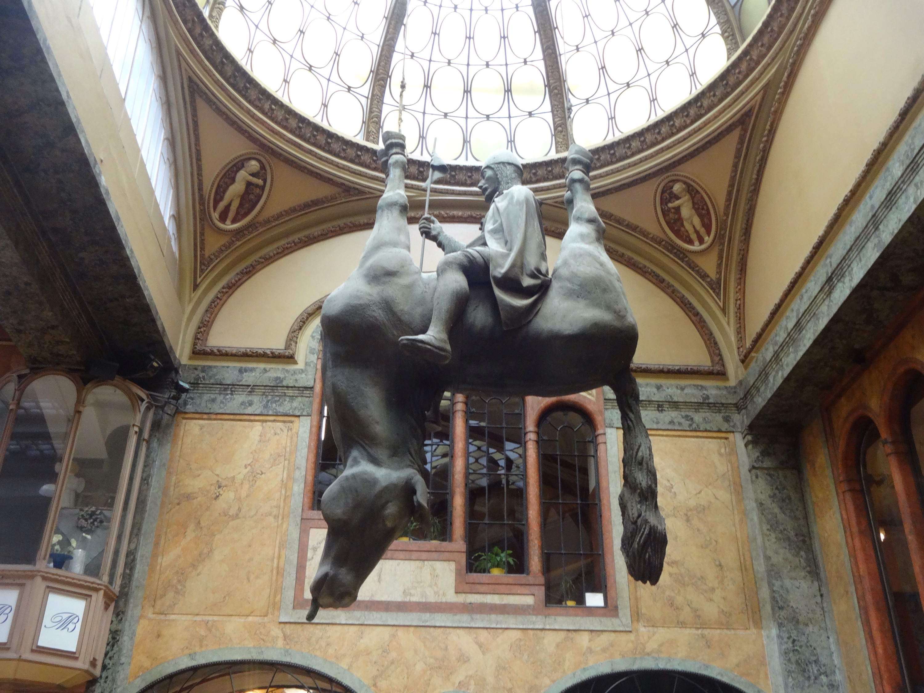 The rain is still with us, accompanied by occasional sleet showers, so it’s a good opportunity to explore some of the local shopping malls. Many are teasingly hidden inside ornate buildings, creating a network of corridors and great design. Along with a horse hanging upside down. As you do.