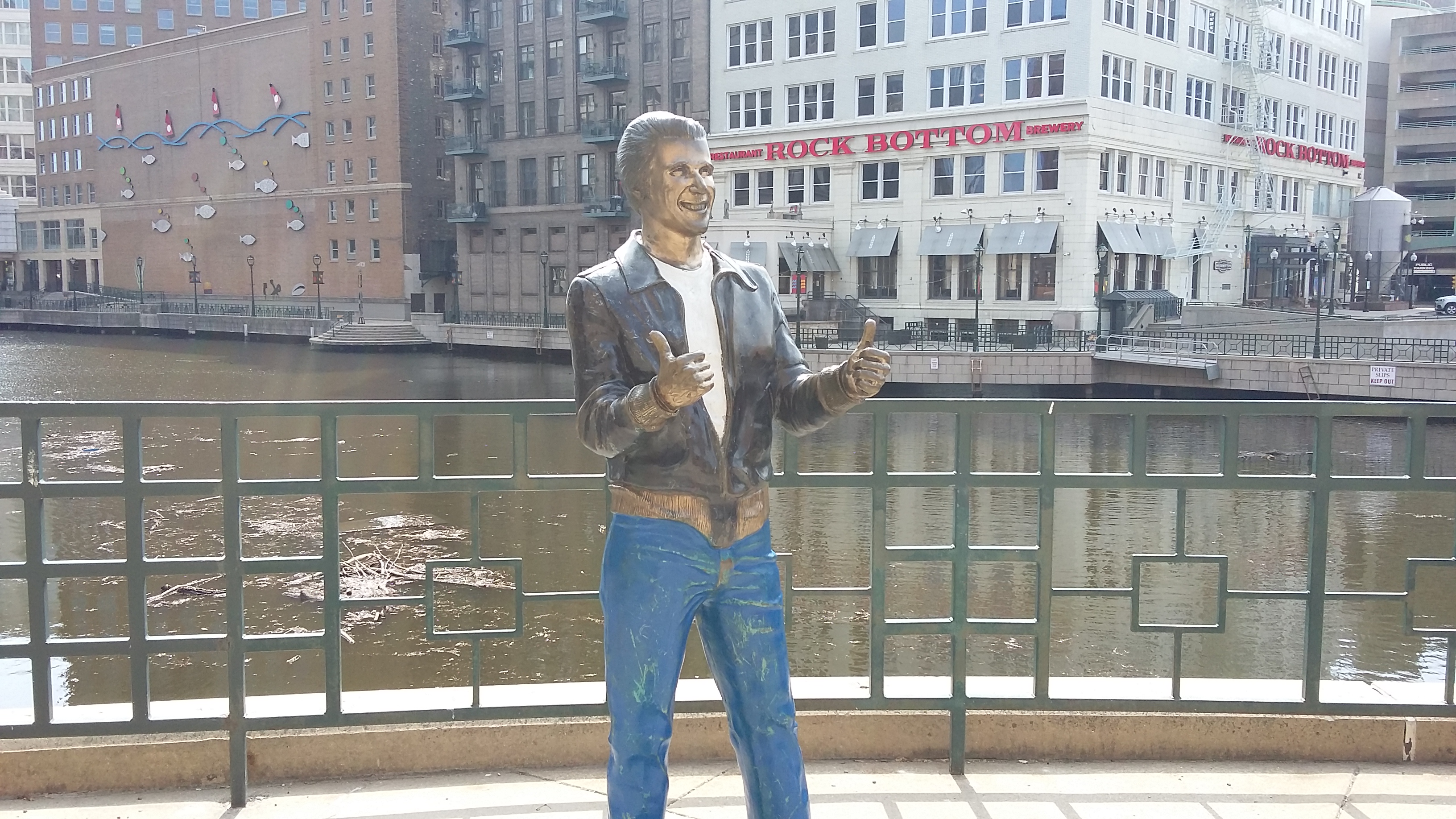 And this seems to set the theme for the day, The Riverwalk would be nice enough on a warmer day, and maybe the sight of Arthur Fonzerelli would raise a smile. But the Bronze Fonz is actually smaller than life, with his jeans looking like they’ve not been washed or ironed since the 1950s.