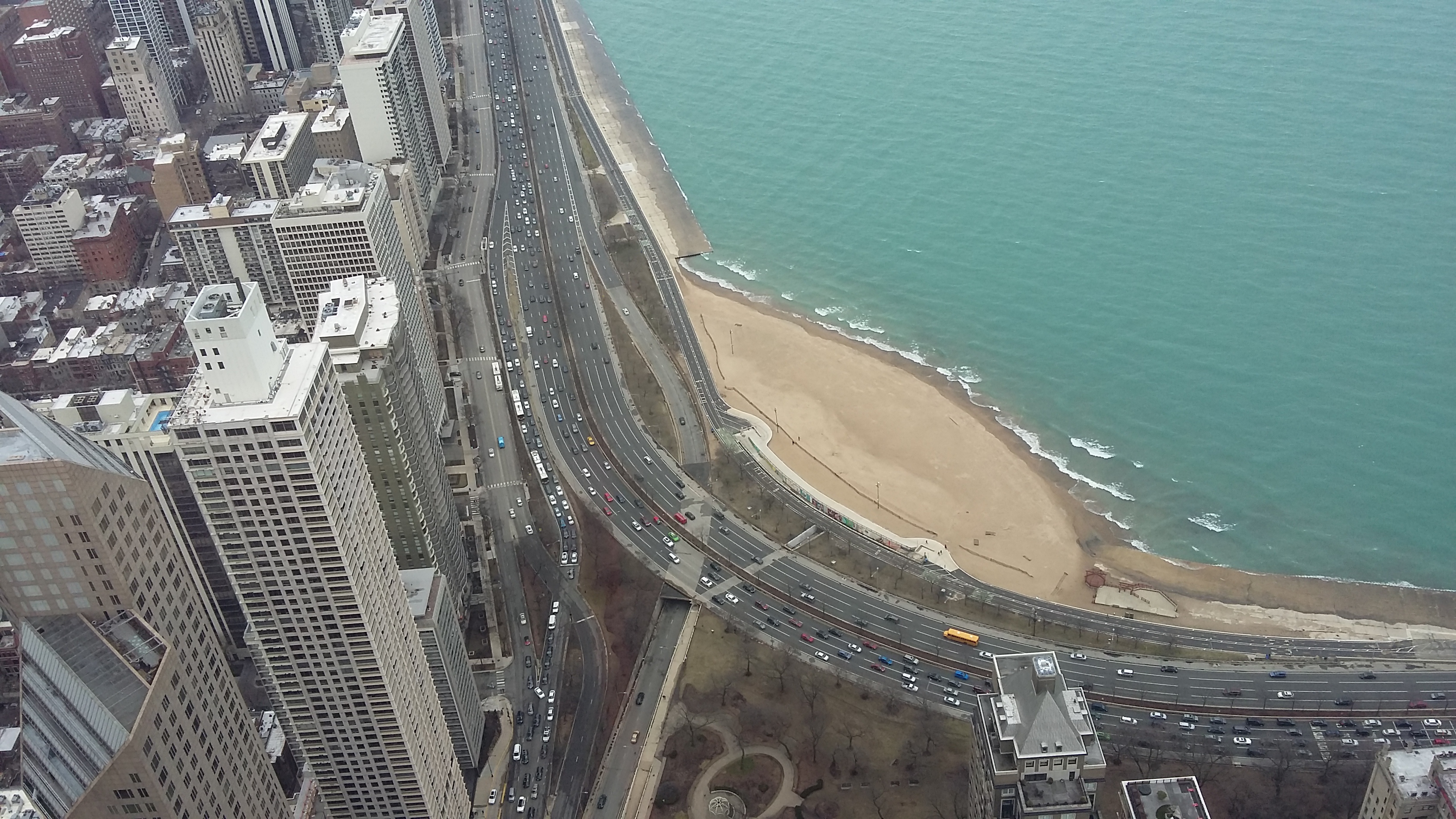 Oak Street beach runs right alongside a main road, so although it looks peaceful enough, the sounds of the traffic is never too far away. In the warmer months this place is heaving with locals and tourists, but the Windy City is today living up to its name, with a big chill factor outside. So a better place to admire the view is from another tall tower – the John Hancock Centre.