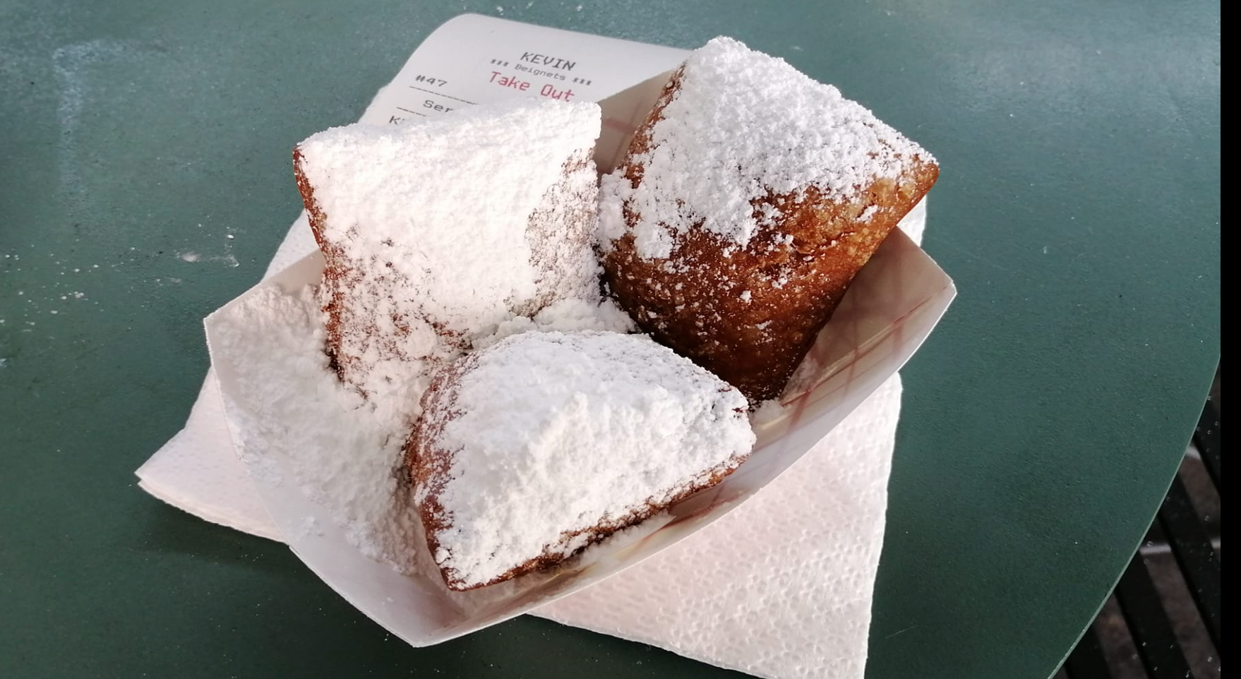 Once again, something is missing. The visitors. There are some tourists around today, but not nearly as many as there should be. Most of the voices are English; before the Pandemic there would be a global selection of languages being spoken. But some things never change, including the lengthy queue outside the Cafe Du Monde. It’s universally considered to be the best place to get Beignets, the fried square donut served in threes and drenched in icing sugar. They are delicious, but caution is needed – any dark clothing will inevitably be dusted with sugar in the slightest of breezes, making you a possible target for the narcotics squad should you later enter a bar in the same outfit.