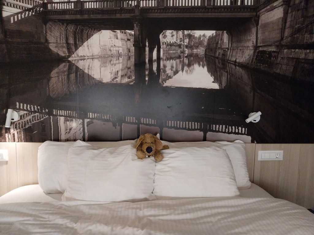 The City Hotel is a three star establishment. But three stars here means far more luxury than I saw in Lyon or Salzburg. The room is large, sparking clean, and of course NewsMutt is first to try out the enormous bed.