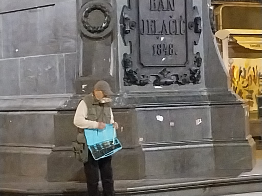 In the Old Town, the main square is named after Count Josip Jelačić, a national hero who earned his fame during the Hungarian Revolution of 1848. And while old Joe might have a fancy statue, it’s a man standing next to it who catches my eye.