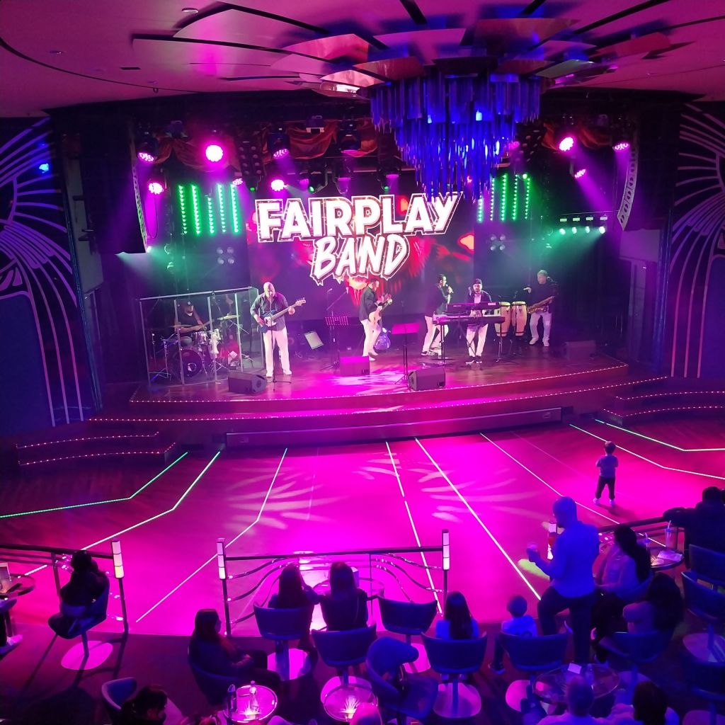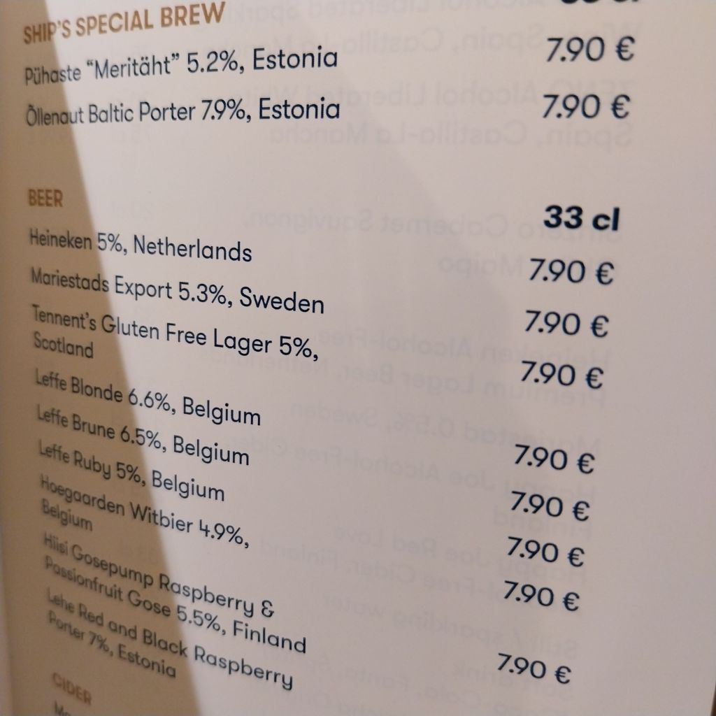 Friends commented that these prices were cheap by Scandinavian standards. They were allegedly tax free, which made me wonder exactly how much the taxes would be once we arrived. Helpfully my ticke included two promotional drinks – a beer and a sparkling wine, each for just under 4 Euro. I’d missed the bingo, but was in ime to soak up a show at the Starliight Lounge.
