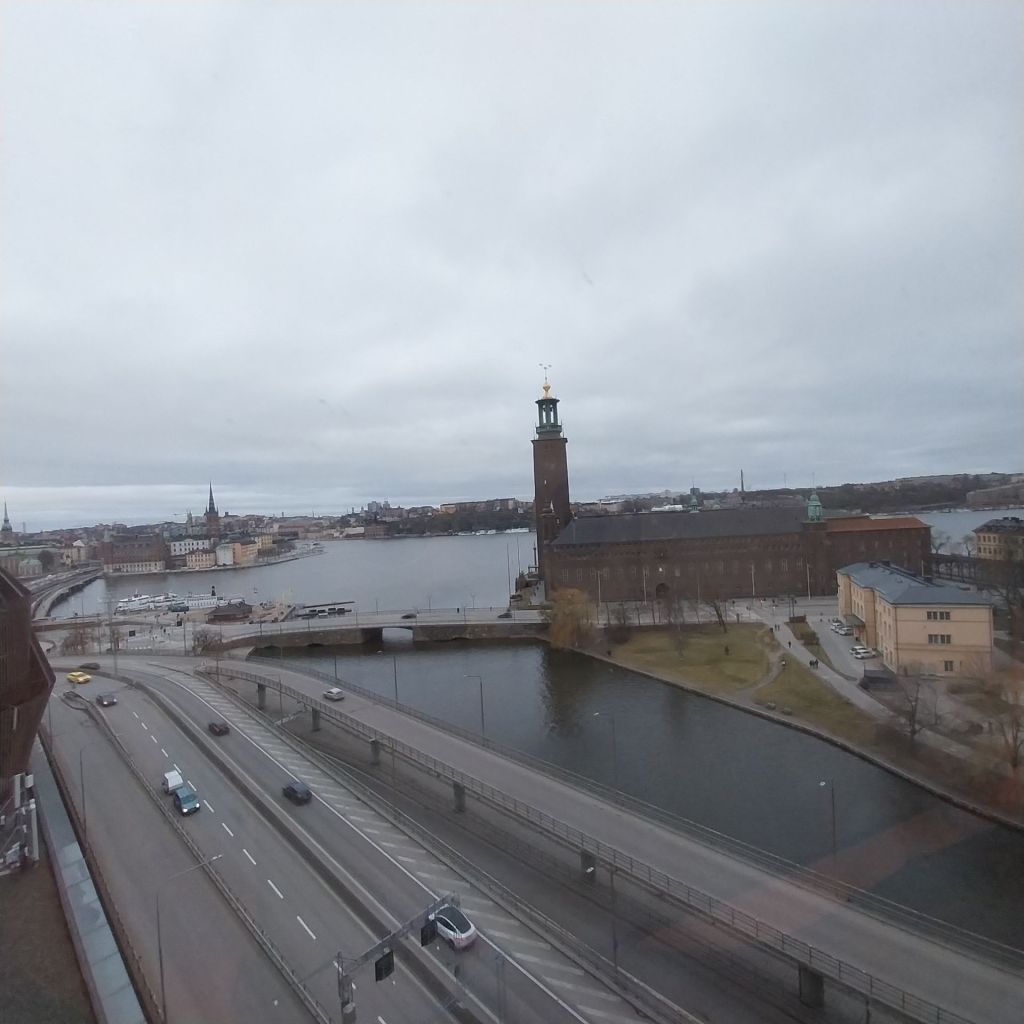 I’d decided to once again upgrade my stay in Stockholm by booking a room with a view at the Radisson Waterfront. This being April 1st, my self checked in key didn’t work, so the receptionist issued a new one. This didn’t work either, so the cleaner let me in. However, that wasn’t going to be much use later in the evening. Eventually a maintenance man called Linus arrived, dismantling the electronic key lock. “Oh I know exactly what the proble is. The clocks went forward this weekend but someone forgot to tell the locks. It thinks you are too early to be allowed in.” Still, it was worth the short wait, with a spectacular view towards Stockholm City Hall (and the main road.