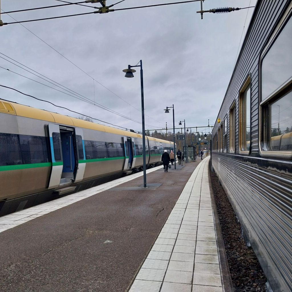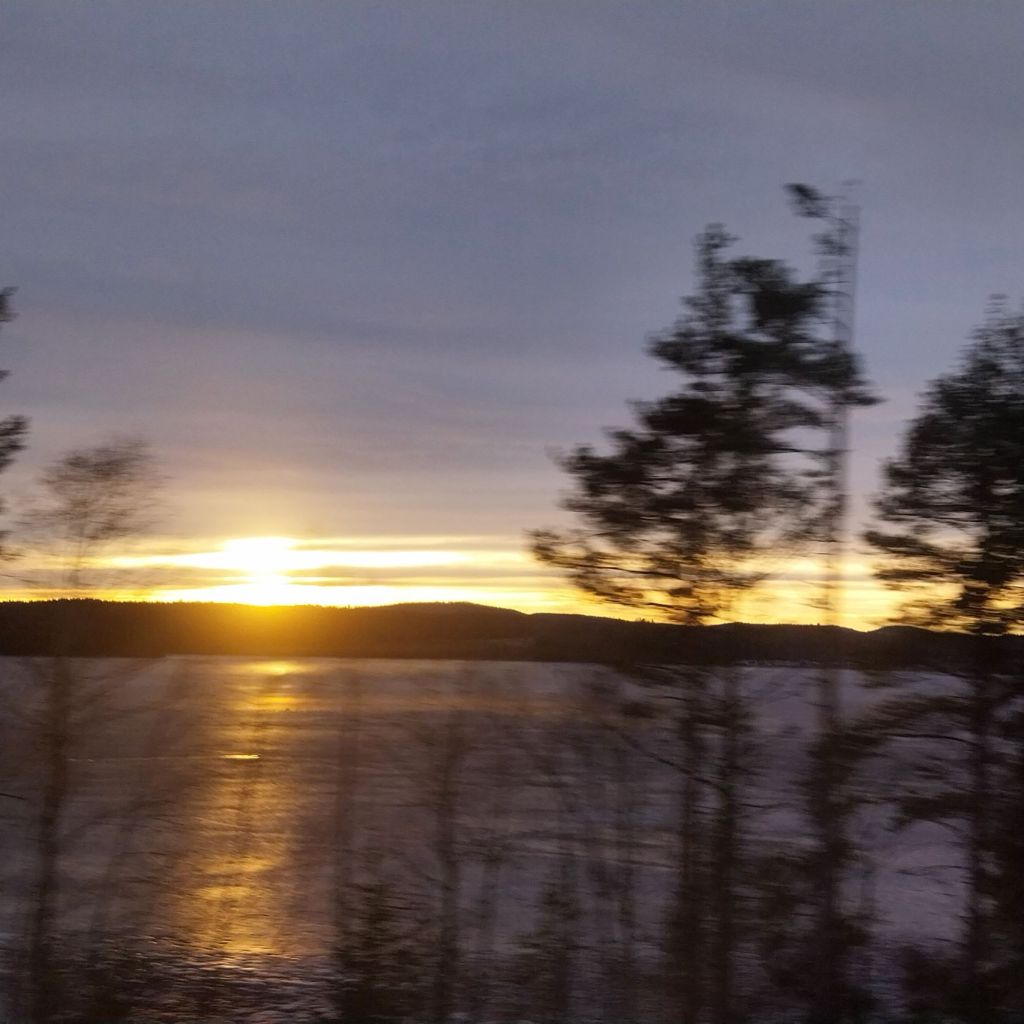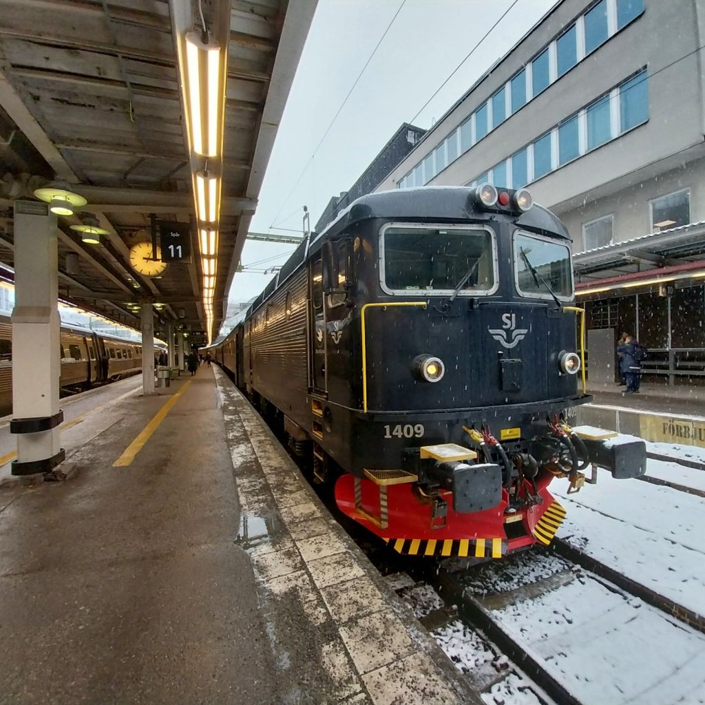The snow on Stockholm continues as we head west across the Swedish countryside. The views aren’t the best, being a little obscured by the snow itself – but the land opens into a classic Nordic scene of pine trees and lakes. The train makes occasional stops at towns along the route, with just a handful of passengers joining or – more likely – leaving.