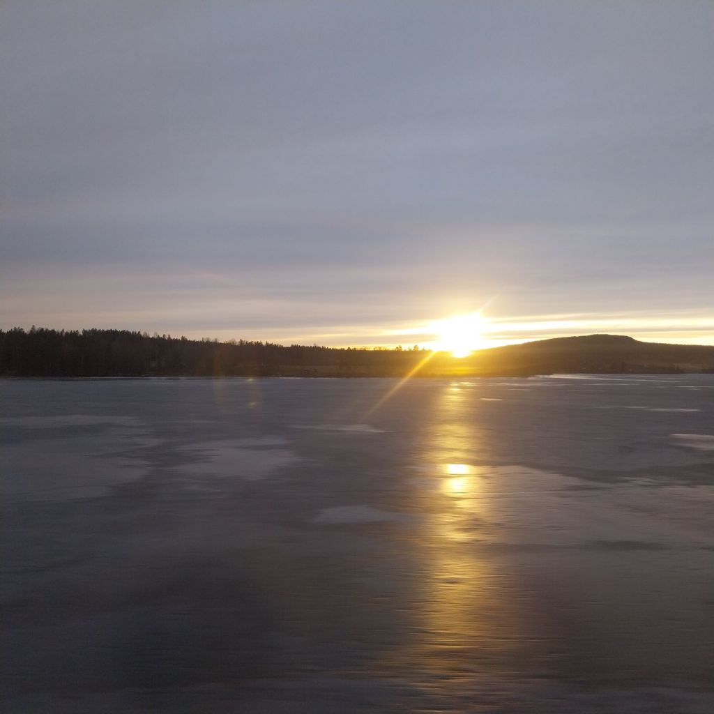 As we approach the border with Norway, the trail line hugs dozens of lakes and small fjords. The earlier grey skies have cleared, giving way to a chilly evening and a spectacular sunset.