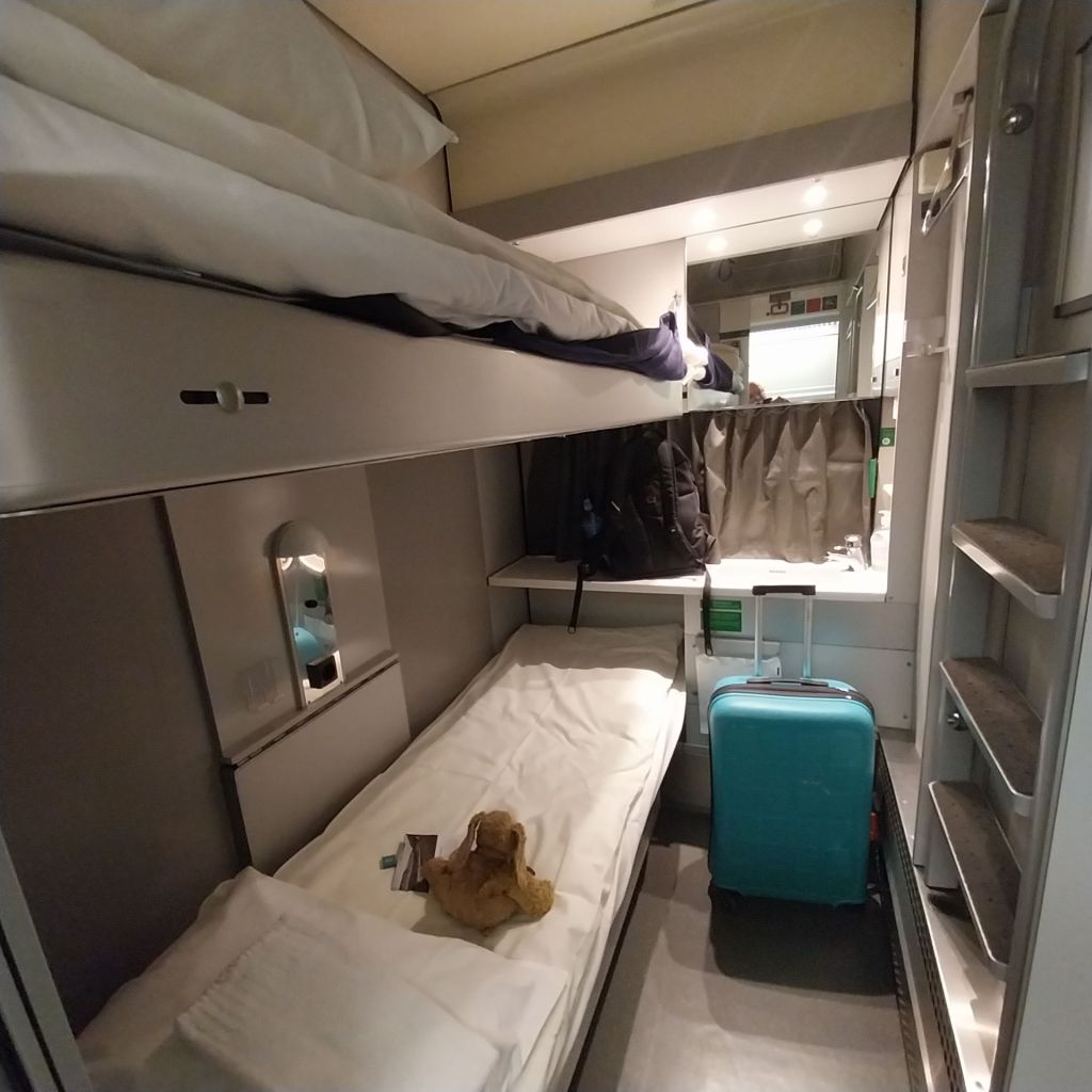 There is storage space for luggage above the door, but I can’t be bothered trying to carry it up using the ladder to the right. I suppose I could have dumped the case on the top bunk. However, it’s late and I’m tired. Ready to be lulled to sleep by the gently rocking of a moving train.