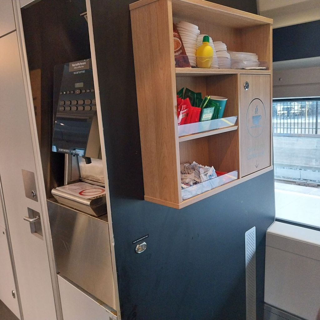 The Norwegian state railway, VY, is an organised affair. Reservations for their poplar service are compulsory, but if you have a first class rail pass they’re free of charge. And the Plus carriages provide huge amounts of legroom and comfort. A nicer touch is the drinks station, allowing passengers to help themselves to coffee, tea and hot chocolate.