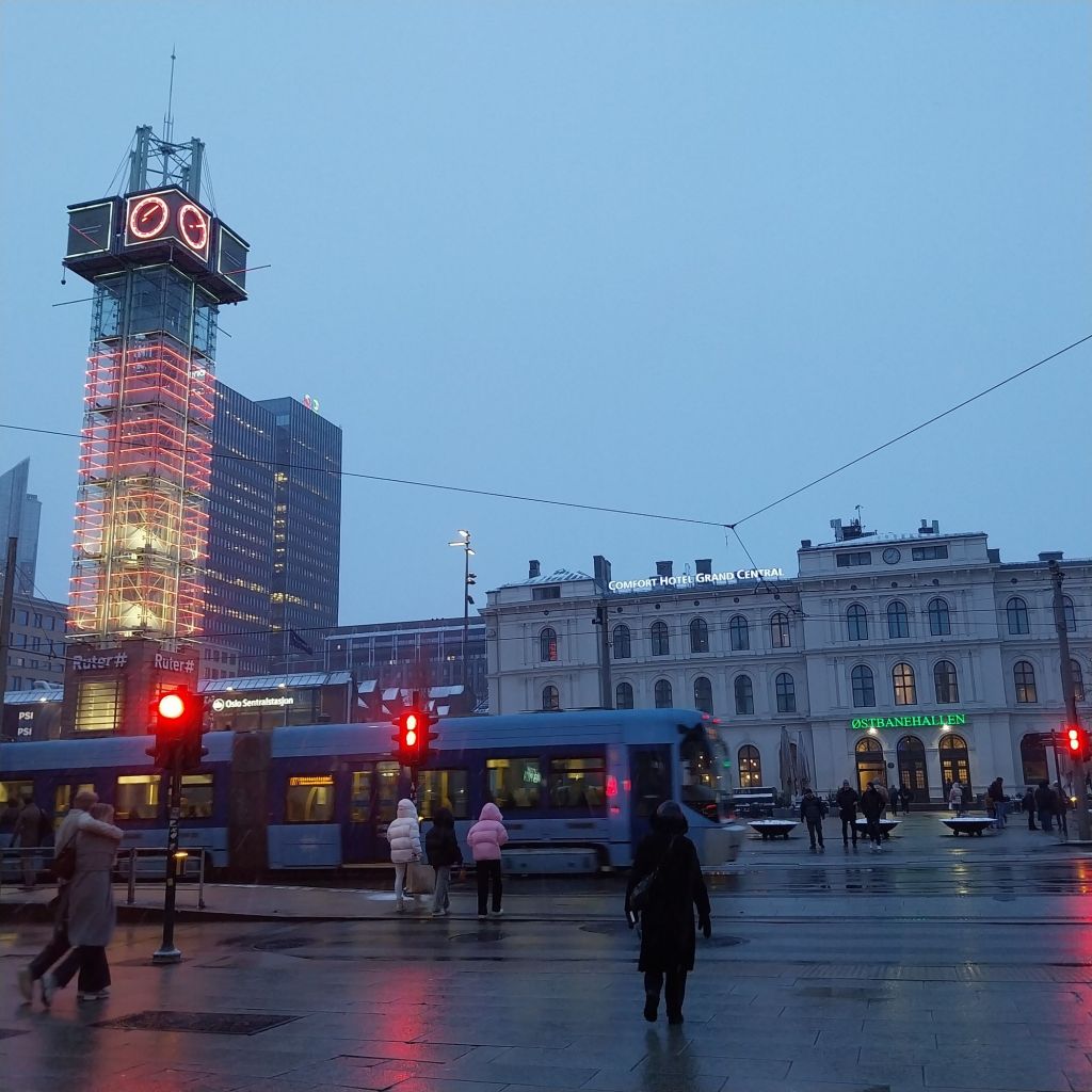 The Norwegian capital was dusted in a wet snow and sleet combinations by the time we arrived at just after 7pm. The Comfort Hotel (Karl Johan) had boasted “no two of our rooms are the same”. I sincerely hoped not, since mine was cramped into a triangular corner of the building with a bed complete with somebody else’s hair still in it. But more of that later. Dinner was served courtesy of the Ostbanhallen, a collection of bars and restaurants in what was the original building of the central railway station. A half decent burger and a beer costs around 30 Euro – approximately half of which was for the beer. It was time to find somewhere cheaper.