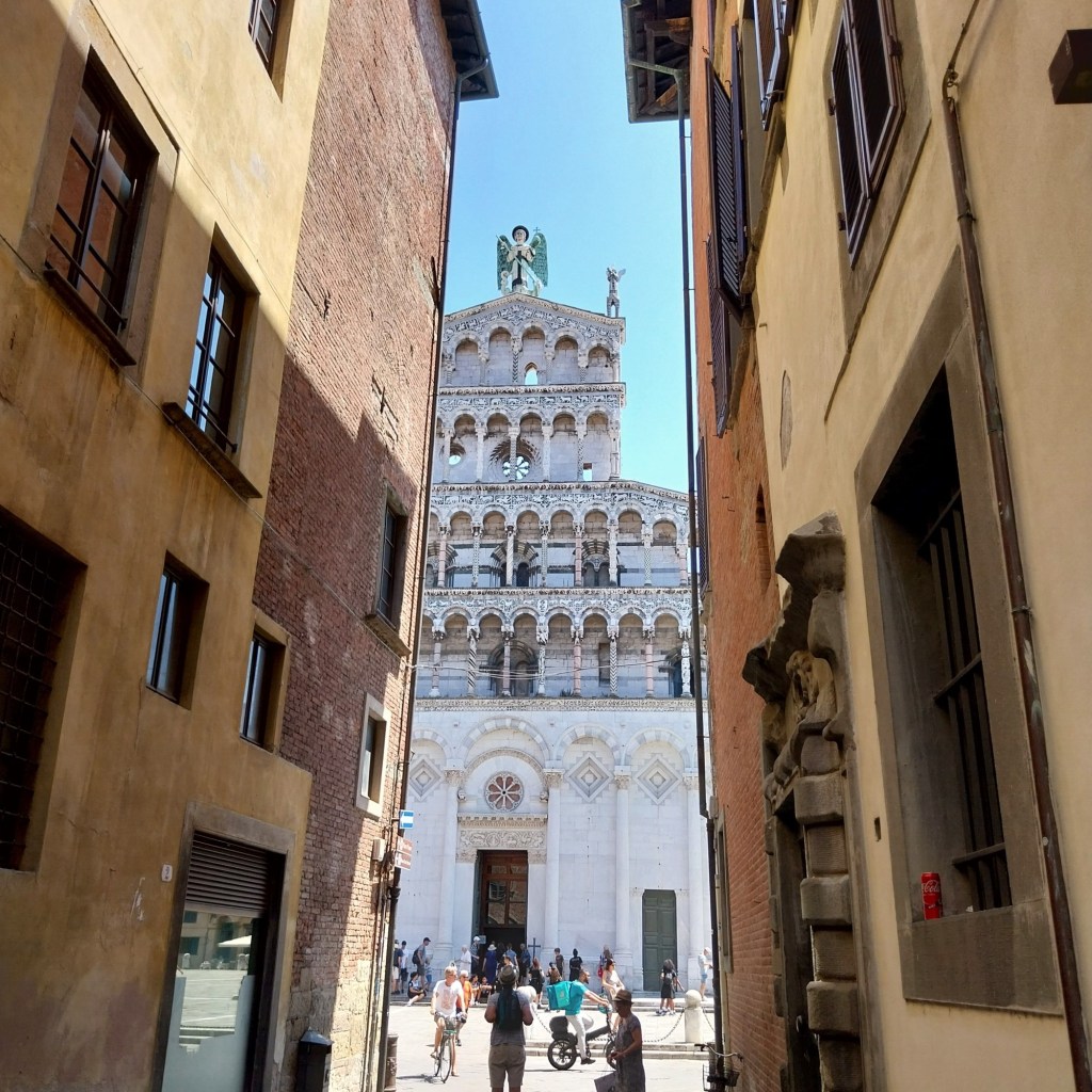 Unlike many of the hill towns in Tuscany, Lucca is relatively flat underfoot, but you still need to get through the enormous city walls first. A path from the railway station leads through a tunnel and onto the walls themselves, giving a good view of everything below. Many visitors make a point of walking the entire circuit, but on a hot July day I want to explore within.