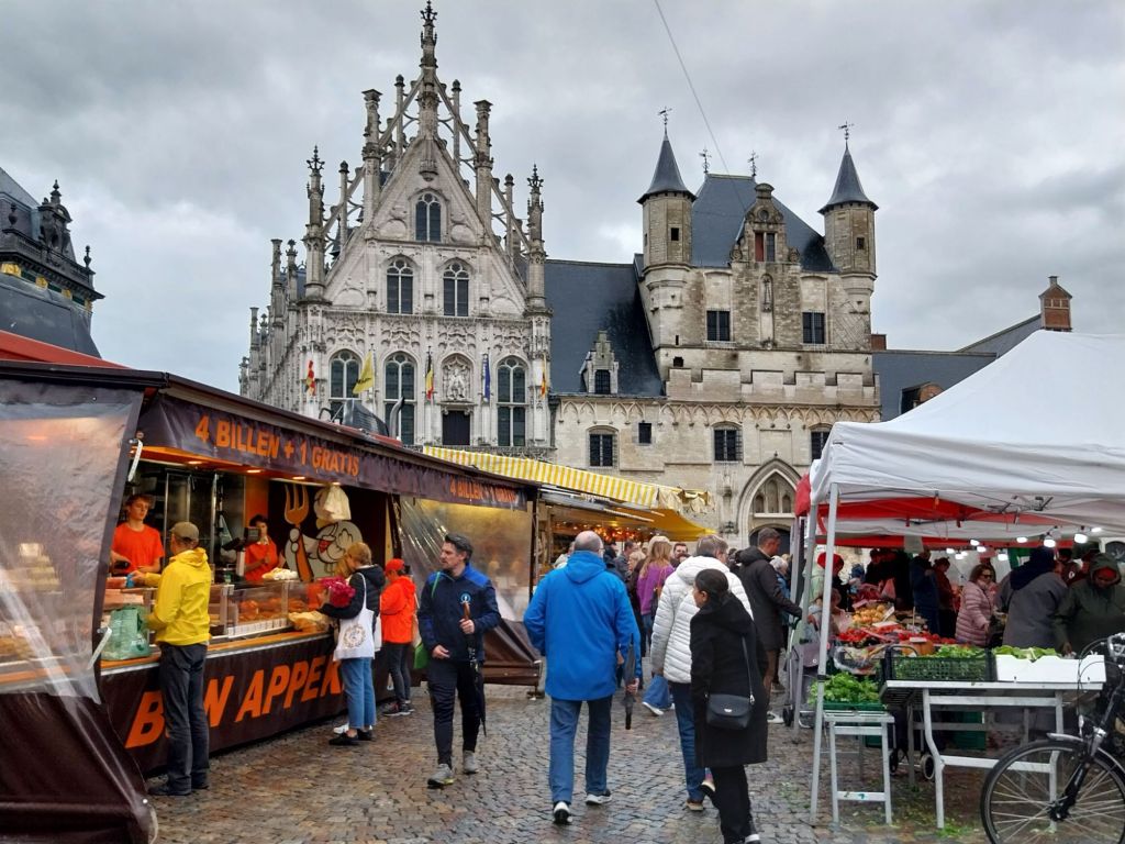 It’s a wet day but that doesn’t deter the traders at Mechelen’s market. Fresh produce, cooked food and flowers are the order of the day, all under the watchful eye of the Town Hall.