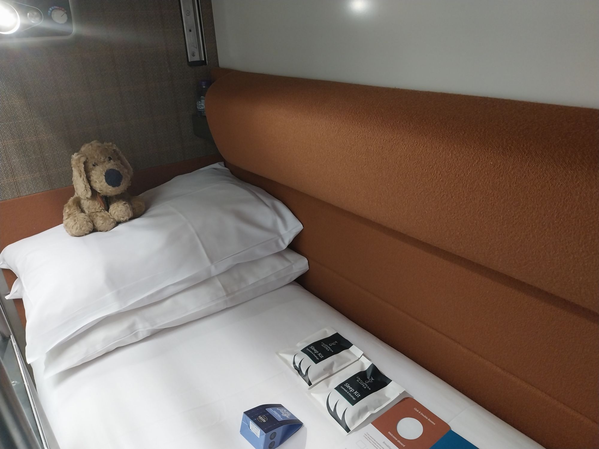 Like many night trains, the Caledonian Sleeper offers a choice of seating and beds. At its most basic, a seat in the main coach – from there, you can book a room that you may end up sharing with someone else (or not, if you’re a couple or in a family), or go for sole occupancy. Here, there are three choices. A Classic room has a shared bathroom at the end of the coach, or a Club Room which includes a toilet and a shower. Again, this isn’t glamorous by any standards – but remember, you’re travelling hundreds of miles and getting a bed for the night. At the very top end of the range you can select a double bed. For most though, it’s a bunk. Barely enough room to swing a cat – which happens to be one of NewsMutt’s favourite pastimes.