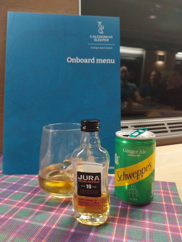 With no cats in sight, I felt safe enough to leave him guarding the room (which does lock with a key card, by the way) and explore the dining options in the Club Car. For many, this is one of the highlights of the Caledonian Sleeper – many in Europe don’t have full catering or a bar. We’ve barely left Euston, but already there are two couples and a group of hiking lads making the most of it. Unlike the lounge, there are no free drinks (even soft ones) here. But for a train, the prices are reasonable. And there’s the chance to get into the true Scottish spirit by sampling a fine single malt to help you sleep.