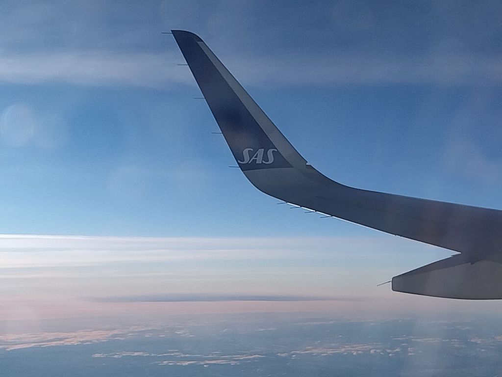 The flight itself is pleasant enough, taking less than two hours. Somewhere over the Norwegian coastline, vast landscapes of forests and frozen lakes emerge, the captain helpfully flying low enough for us to see the view. There’s little cloud around today, and the late afternoon flight gives us a beautiful sunset across the Nordic landscape. It’s much more breathtaking than this photo suggests, blurred by the reflection on a worn window.