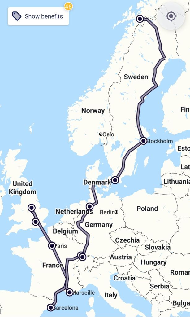 I had considered doing a huge, narrow horsehoe from home to Norway before heading South, but time and logistics didn’t permit such an ambition; it would have taken three or four days to get to northern Norway from the UK by train, and ferries no longer run from England to the famous ports of Bergen and Oslo.