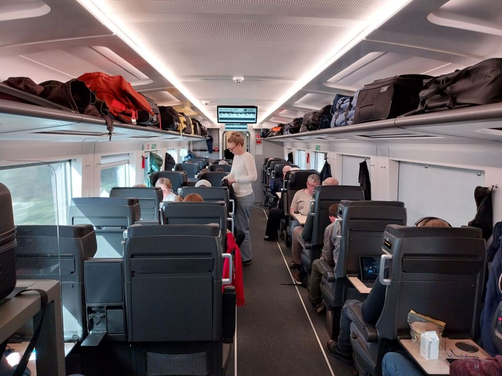 As with Swedish trains, there’s free tea and coffee in first class, and a nice touch with a basic snack served at seat shortly after boarding. There’s no dining car, but snacks and drinks can also be bought from a vending machine between first and second class. It was all going rather well.