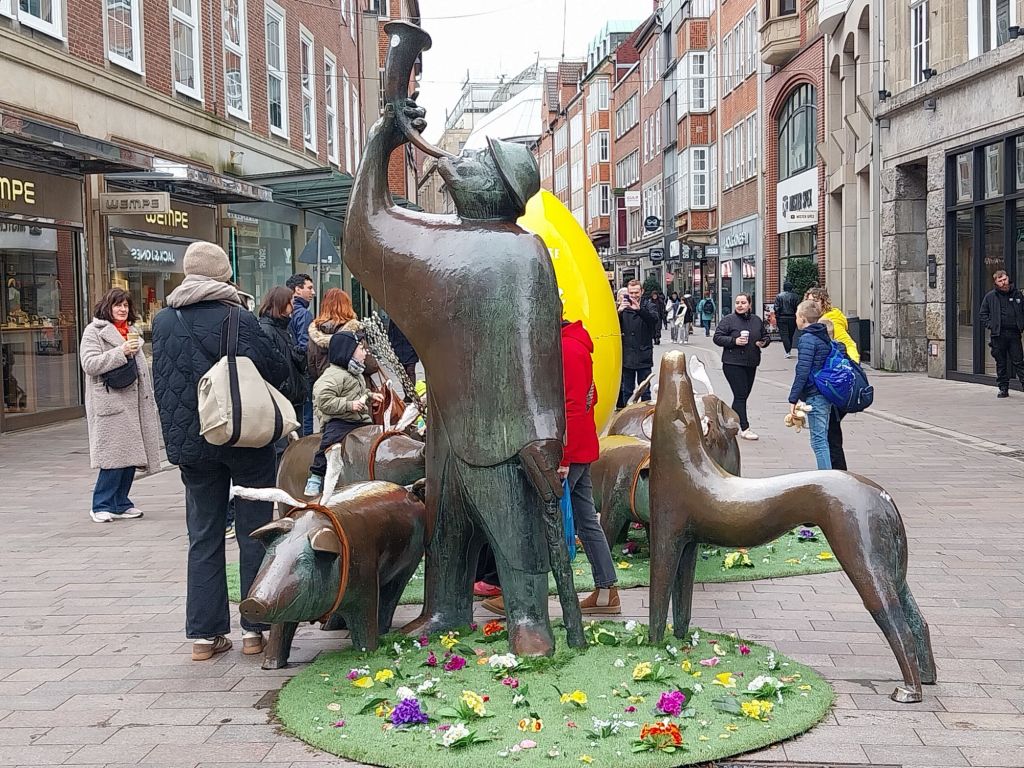 Bremen is a modern and confident city; it has Germany’s second largest seaport, and Mercedes Benz employs some 40,000 people here. It manages to combine industrial functionality with elegance, including a number of statues and sculptures across the city. The Shepherd and His Pigs today features a less than elegant protest by the animal rights group PETA – who are demonstrating against the plight of fish. In the Boettersrasse, the them is more feline.