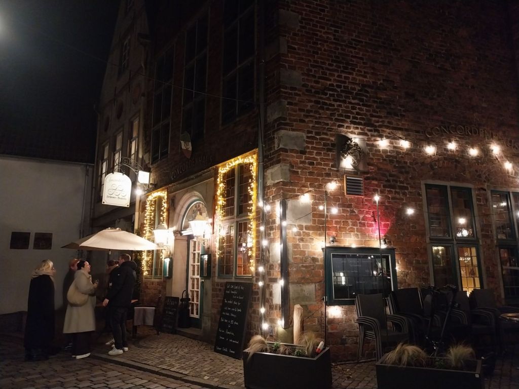 The Schnoor takes on a different feel by night, at least out of season. The small passageways that were filled with visitors at lunchtime are mainly empty. But there are a few bars and restaurants here, notably the Concordenhaus, reconstructed by a hundred volunteers in 1953. The ground floor now houses a stylish bar with some of the most friendly staff I’ve met during this trip.