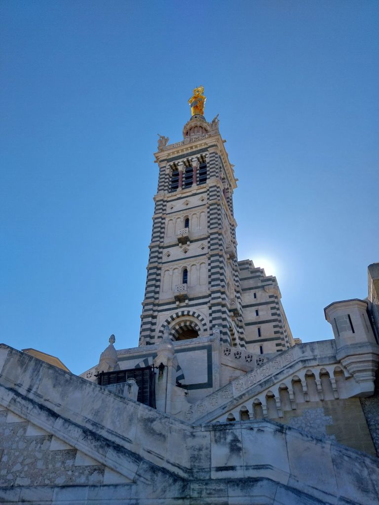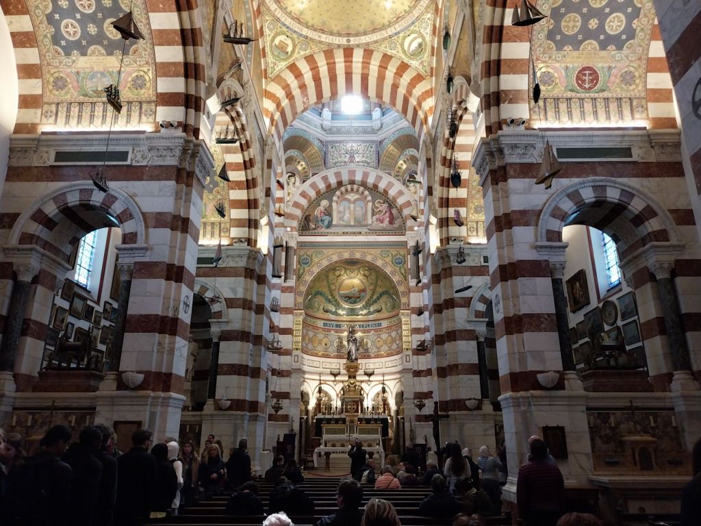 A more famous place of worhship is Notre Dem de la Garde, the hilltop Basilica that features in many pictures of Marseille. As observed during my previous visit, a tacky tourist train takes you up the hill – but for fraction of the price you can take the number 60 bus. Many have done so today, enticed by the ornate church and the stunning views back over the city.